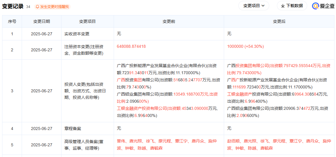 北极星电力网获悉,近日,广西能源(600310)集团有限公司发生工商变更,注册资本由64.8亿元人民币增至100亿元人民币,增幅约54%,同时部分高管发生变更。